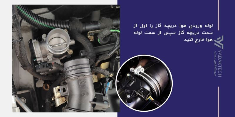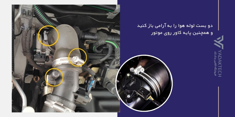 باز کردن بست های لوله های ورودی به دریچه گاز و یکی از پایه کاور موتور؛ به وسیله چهار سو یا بکس 7 بست های لوله را باز کنید، و به آرامی لوله های ورودی به دریچه گاز را اول از سمت دریچه گاز و سپس از سمت لوله خارج کنید. و پایه مشخص شده کاور موتور را با دست باز کنید.