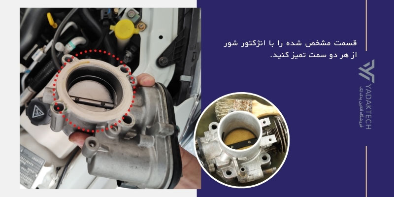 توجه داشته باشد که به قسمت های خارج دریچه گاز مثل سوکت، برد الکترونیکی و... اسپری یا بنزین داخل نشود. و درصورتی که در این قسمت ها آغشته به بنزین یا اسپری انژکتور شد؛ مدتی دریچه گاز را در جایی بگذارید تا به صورت کامل خشک شود.