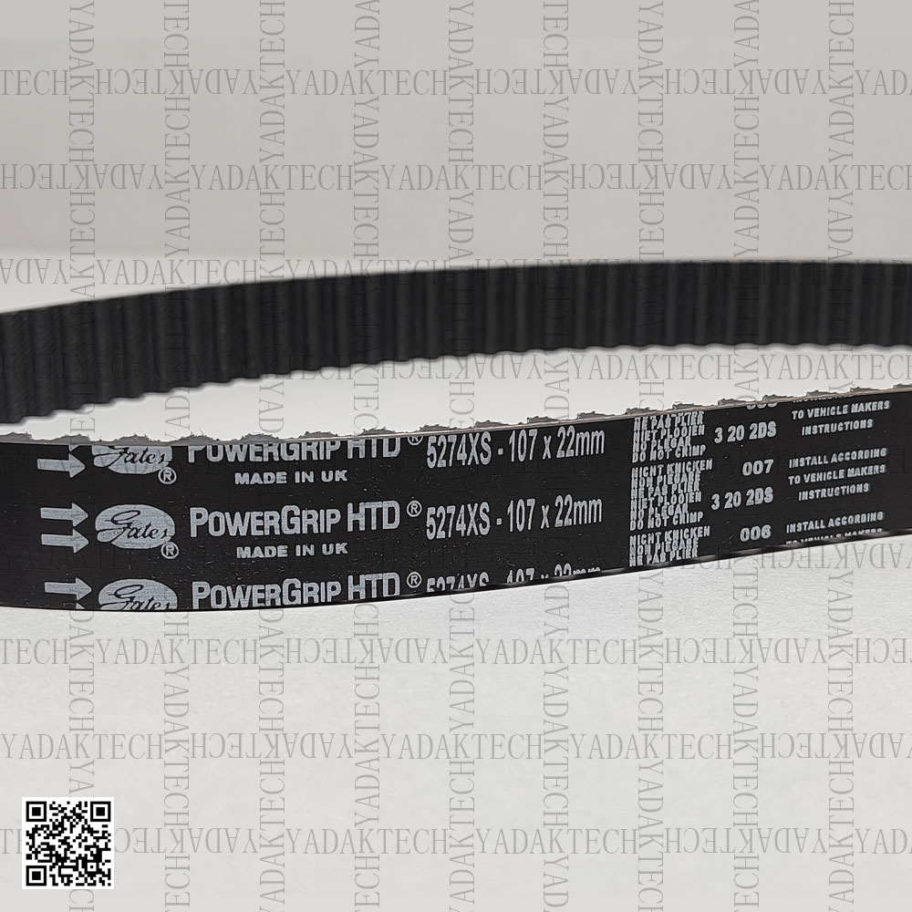 درون بسته بندی یک تسمه تایم 107 دندانه کد5274-XS با برند پاورگریپ وجود دارد، که توسط هرینگتون بسته بندی شده، بر روی تسمه تایم نوشته و اعدادی وجود دارد که هر کدام نشانه چیزی است.