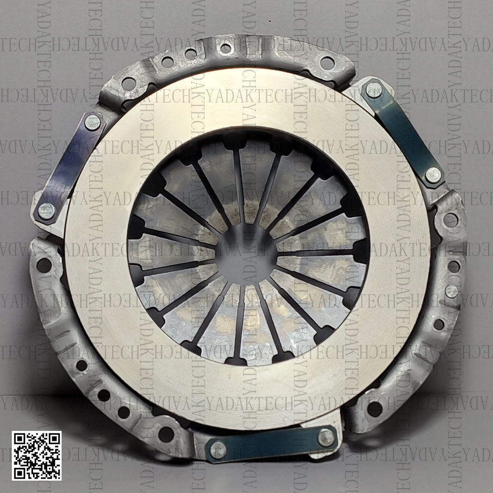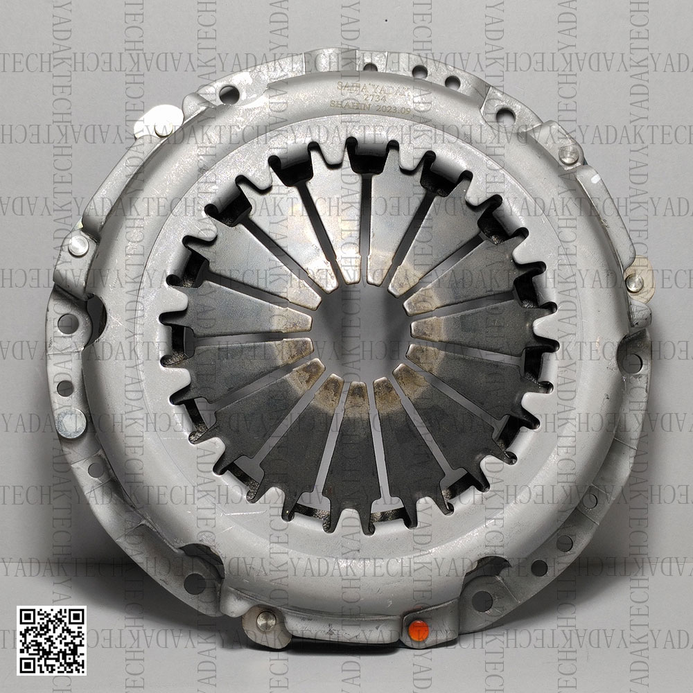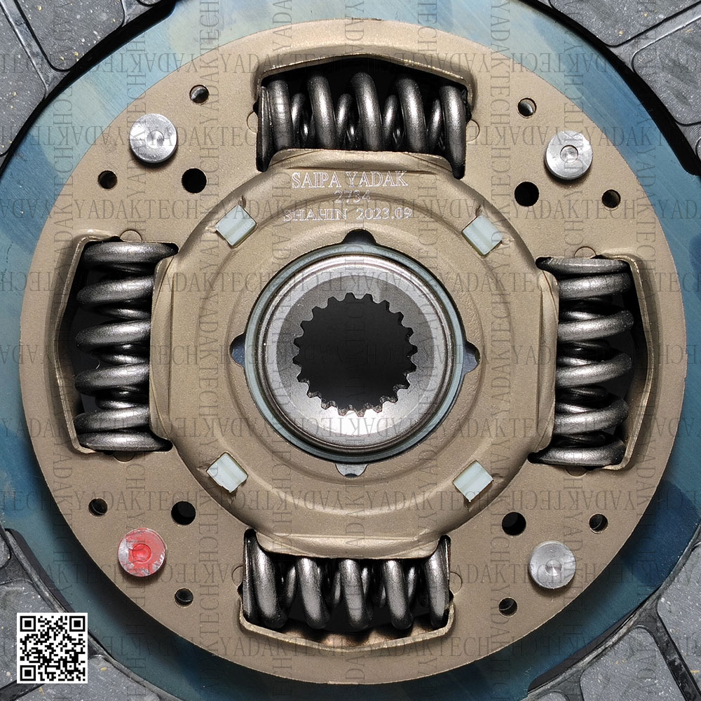 2. صفحه کلاچ شاهین: صفحه کلاچ از نوع پری دمپر و 4 فنر دوبل بوده که نام شاهین، سایپا یدک و تاریخ تولید بر روی آن حک شده.